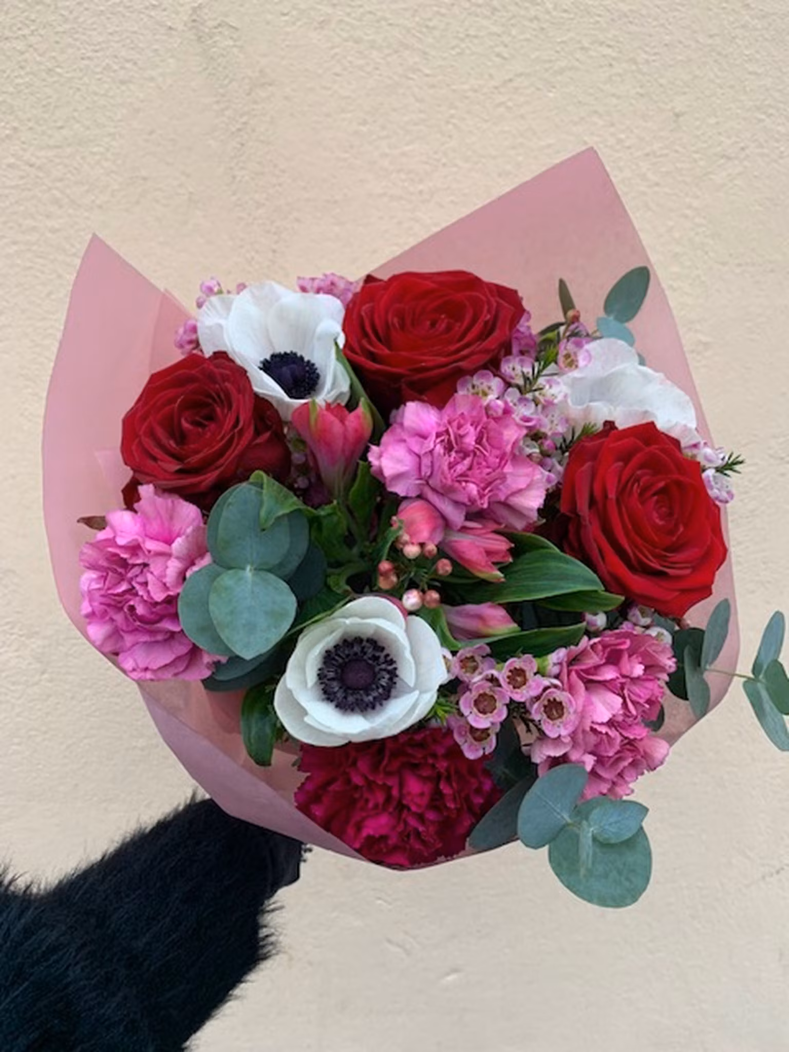 Vi binder en överraskning i butikens stil med säsongens mest kärleksfulla blommor.