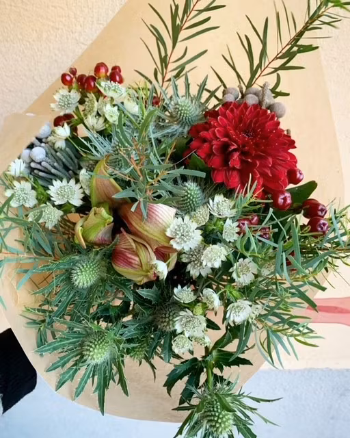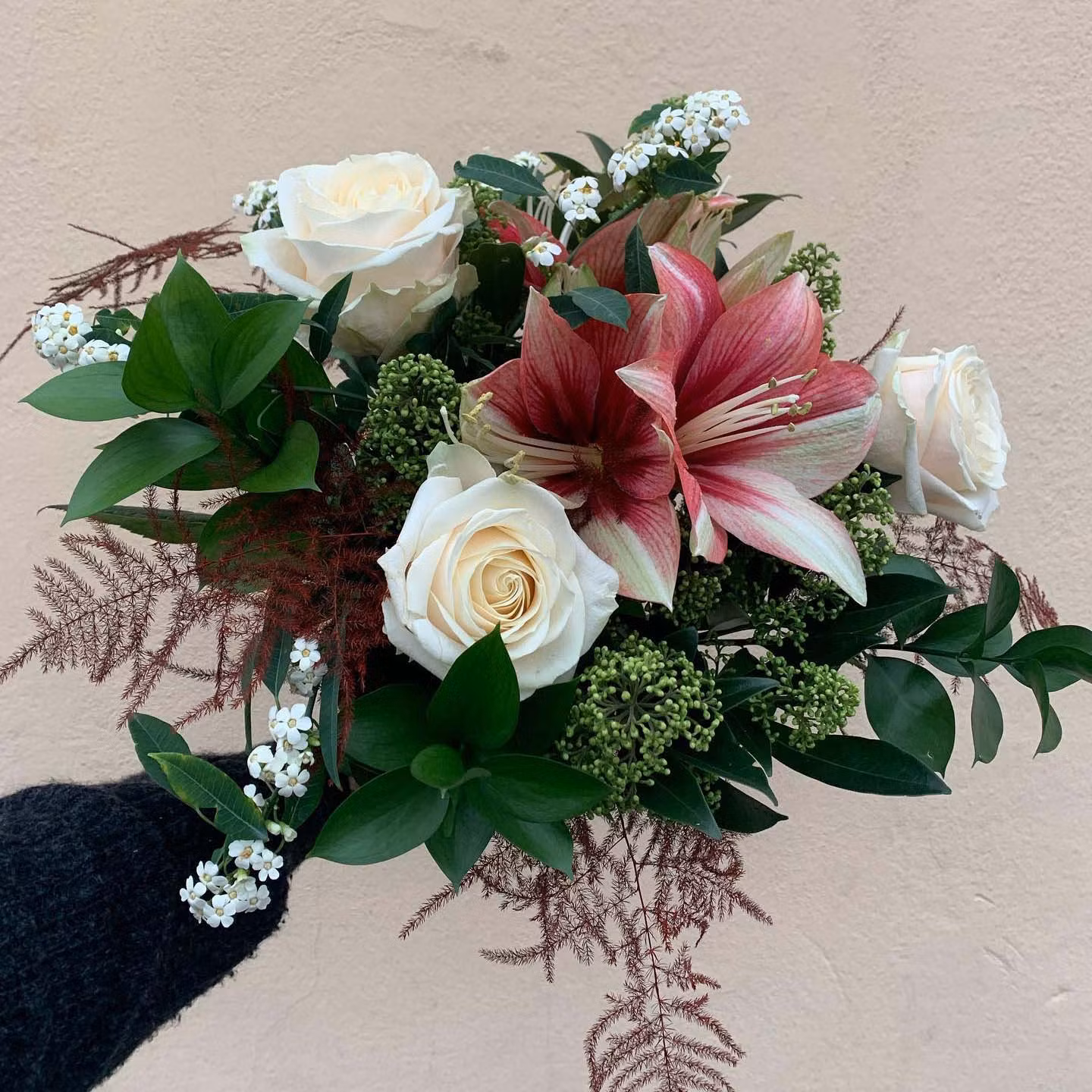 December buketten: Låg bukett med Amaryllis med vintriga/juliga tillbehör och grönt. du kan önska färg på buketten (Första bilden ca 715:-)