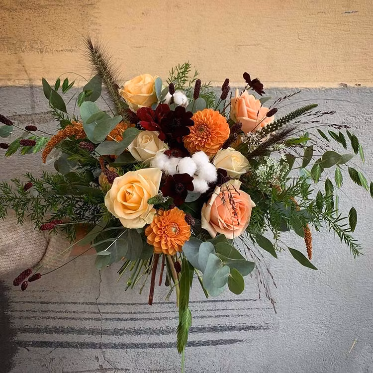 Stor härlig Brudbukett i brun orangea toner. (Bilden 2500:-)