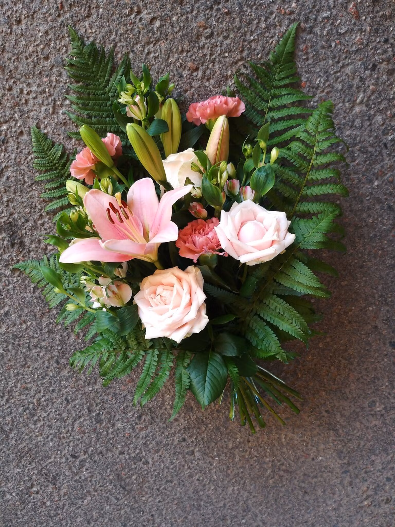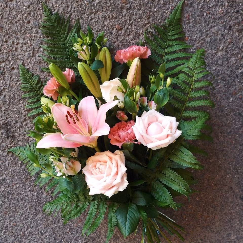 Begravningsbukett med olika blommor i ljust rosa.